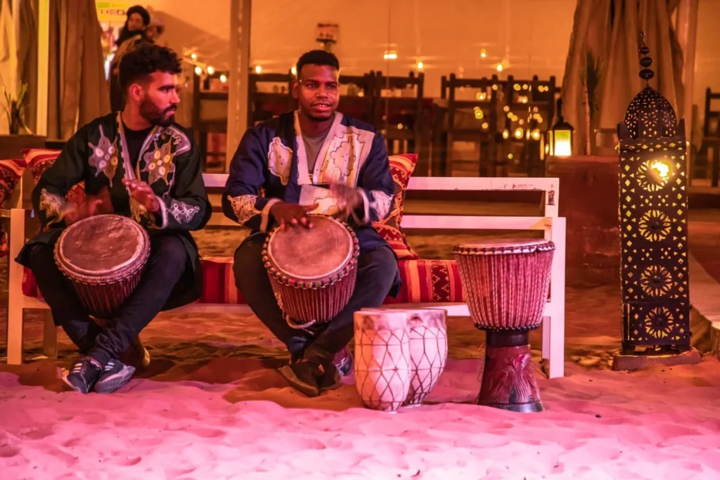 Sunset camel ride, overnight camping under the stars, sunrise camel ride, sandboarding, and traditional Berber entertainment with drumming.