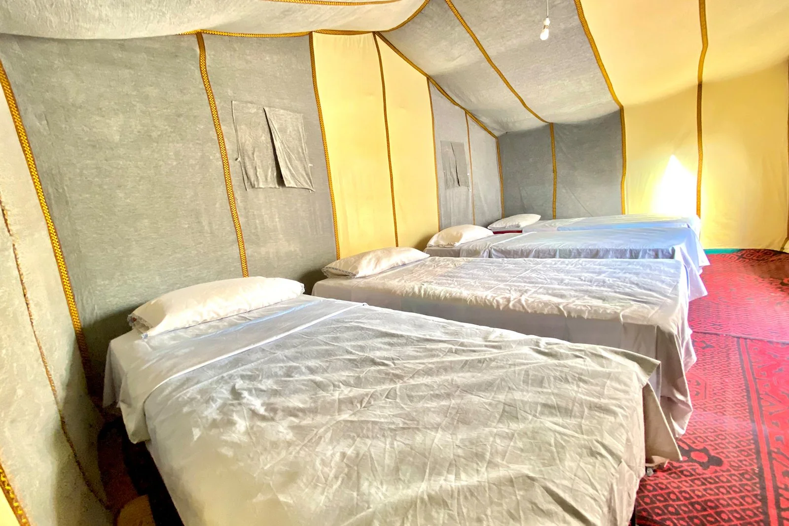 Private tent guaranteed and located in a more isolated and scenic area. More comfortable accommodation with western flushable toilets and hot showers. Rich dinner and breakfast with enhanced amenities for a premium desert experience.